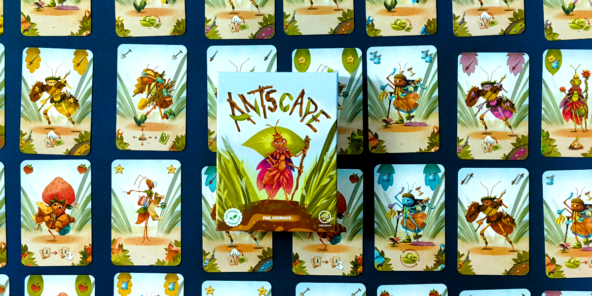 Antscape bestaat volledig uit kaarten van standaard formaat en degelijke kwaliteit. De vormgeving is kleurrijk en speels, met grappige illustraties van strijdlustige mieren. De iconografie is duidelijk en makkelijk te interpreteren, waardoor het spel meteen toegankelijk aanvoelt. We missen wel een player aid, en ook het regelboekje had op sommige punten duidelijker gekund. Op die manier komt een bepaald icoon voor op enkele kaarten, maar wordt dit nergens in de regels uitgelegd.