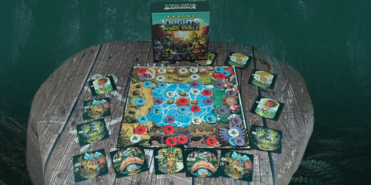 Het spel dat wij hebben getest is een prototype, waardoor er nog wijzigingen mogelijk zijn aan zowel de materialen als de artwork. Knights of the Pond Table bestaat uit een vierkant speelbord met een thematische achtergrond en een duidelijk zichtbaar raster.